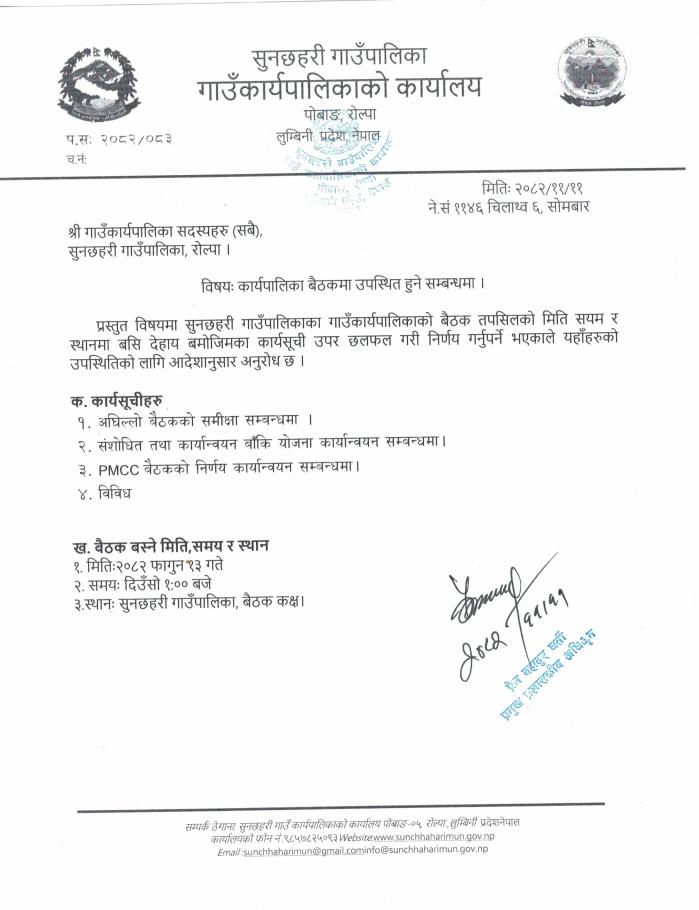 कार्यपालिका बैठक सम्बन्धी सूचना