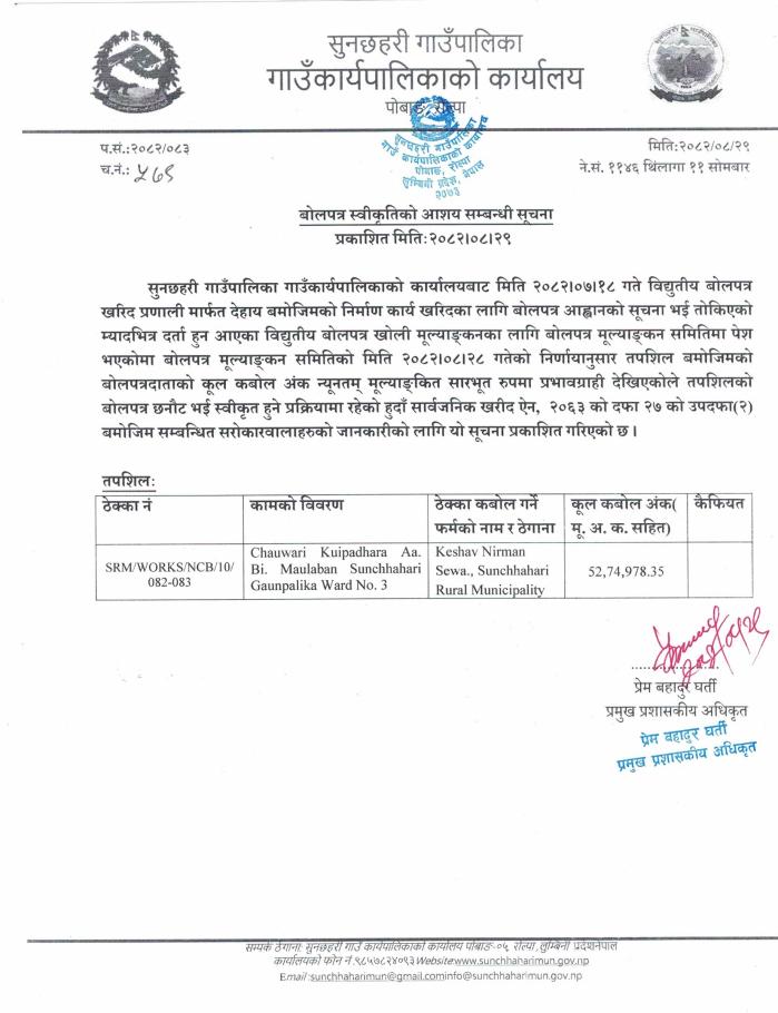 » बोलपत्र स्वीकृतिको आशय सम्बन्धी सूचना l