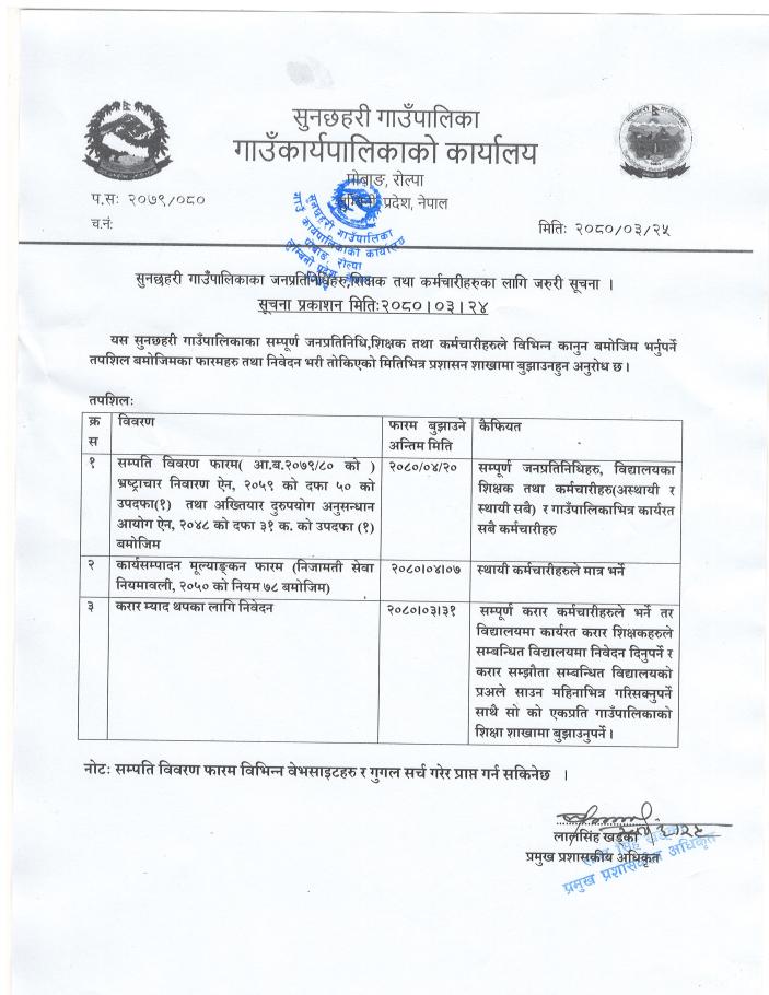 सुनछहरी गाउँपालिकाका जनप्रतिनिधिहरु , शिक्षक तथा कर्मचारीहरुका लागि जरुरी सूचना