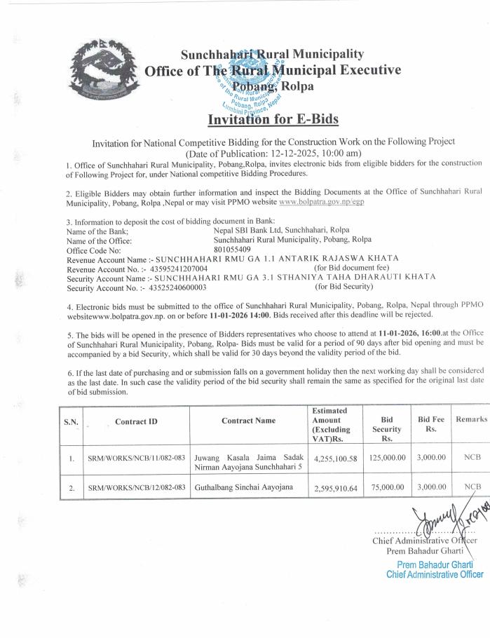 Invitation for E-Bids- Juwang Kasala Jaima Sadak Nirman Ayojana Sunchhahari-5 & Guthalbang Sinchai Aayojana