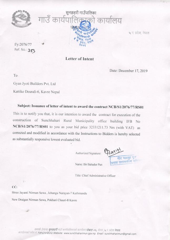 » बोलपत्र स्वीकृतिको आशयपत्र-ठेक्का नं. NCB/S1/2076/077/RS01