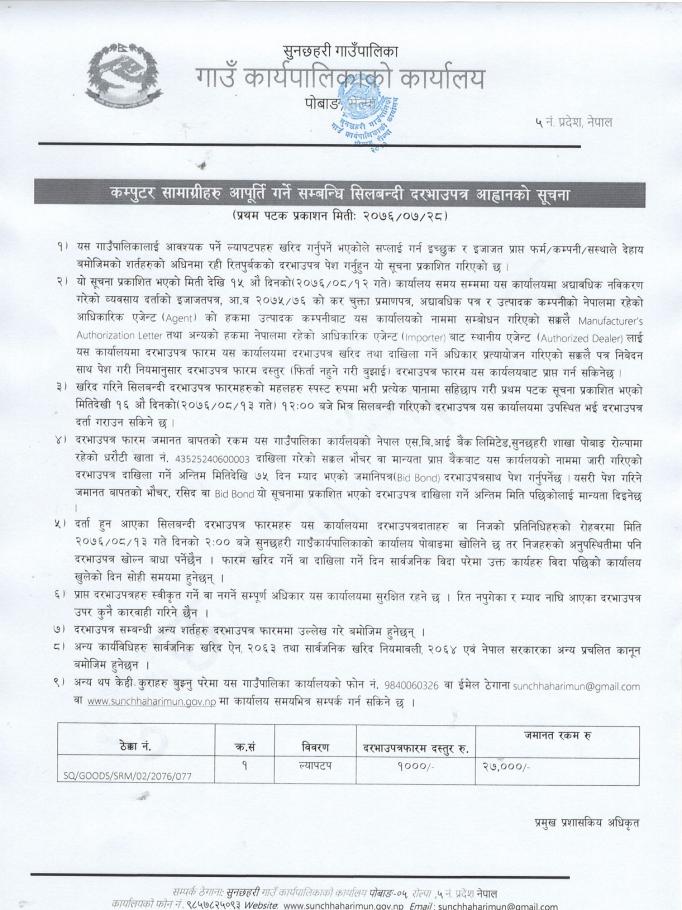 कम्पुटर सामाग्रीहरु आपूर्ति गर्ने सम्बन्धि सिलबन्दी दरभाउपत्र आह्वानको सूचना