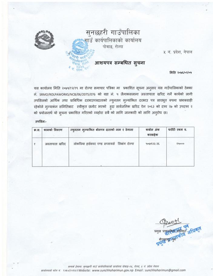 बोलपत्र स्वीकृतिको आशय सम्बन्धी सूचना- ठेक्का नं. (SRM/WORKS/NCB/01 to 08/082-083)