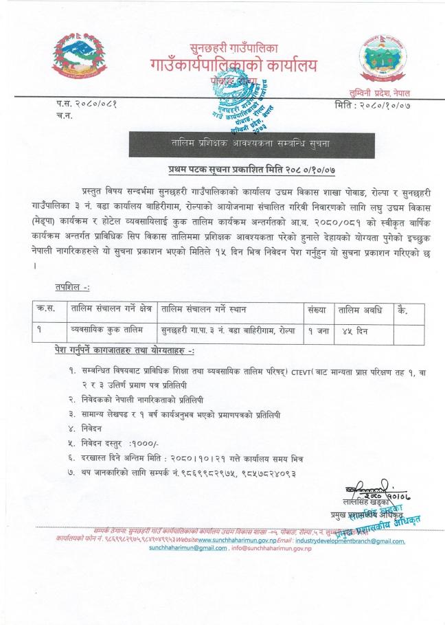 » कुक तालिम प्रशिक्षक आवस्यकता सम्बन्धी सूचना