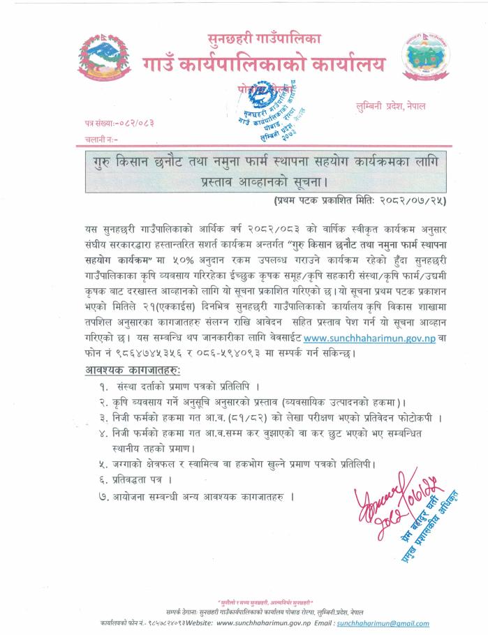 गुरु किसान छनौट तथा नमुना फार्म स्थापना सहयोग कार्यक्रमका लागि प्रस्ताव आव्ह्वानको सूचना l