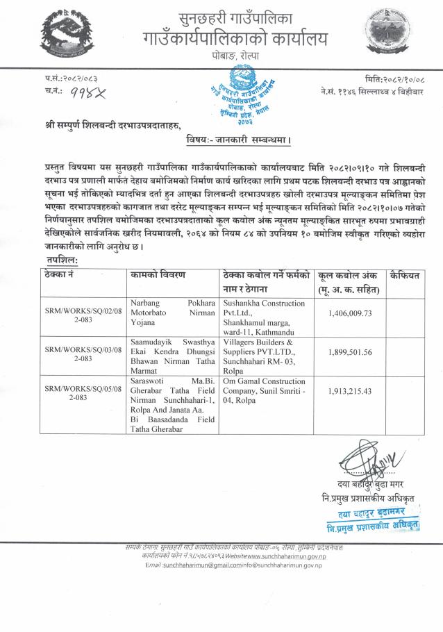 बोलपत्र स्वीकृतिको आशय सम्बन्धी सूचना -ठेक्का नं. -SRM/WORKS/NCB/09/082-083