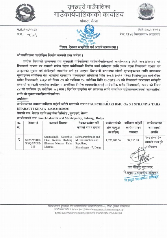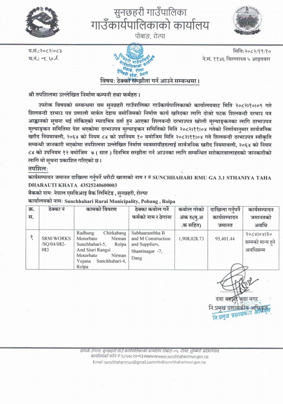 ठेक्का सम्झौता गर्न आउने सम्बन्धमा -ठेक्का नं. SQ-4 & SQ-7