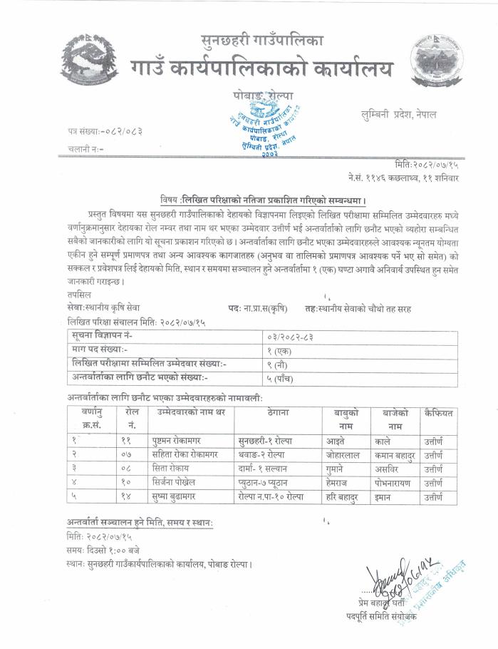 ना.प्रा.स(कृषि) पदको लिखित परिक्षाको नतिजा प्रकाशन तथा अन्तरवार्ता सम्बन्धी सूचना l