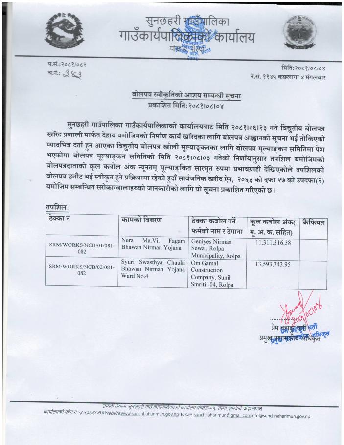 बोलपत्र स्वीकृतिको आशय सम्बन्धी सूचना -ठेक्का नं. SRM/WORKS/NCB/01/081-082 र SRM/WORKS/NCB/02/081-082