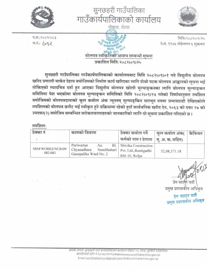 बोलपत्र स्वीकृतिको आशय सम्बन्धी सूचना -ठेक्का नं. -SRM/WORKS/NCB/09/082-083