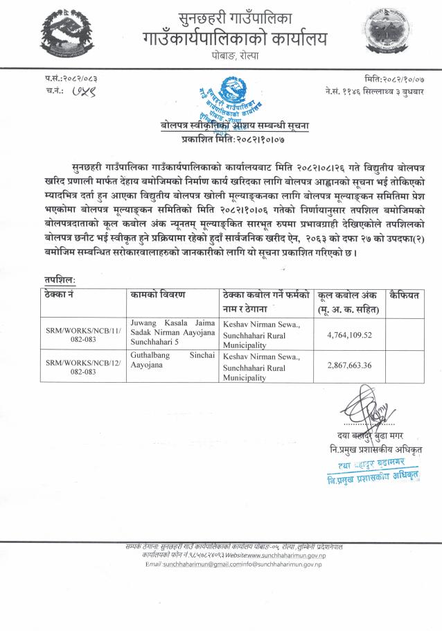 बोलपत्र स्वीकृतिको आशय सम्बन्धी सूचना -ठेक्का नं. -SRM/WORKS/NCB/09/082-083