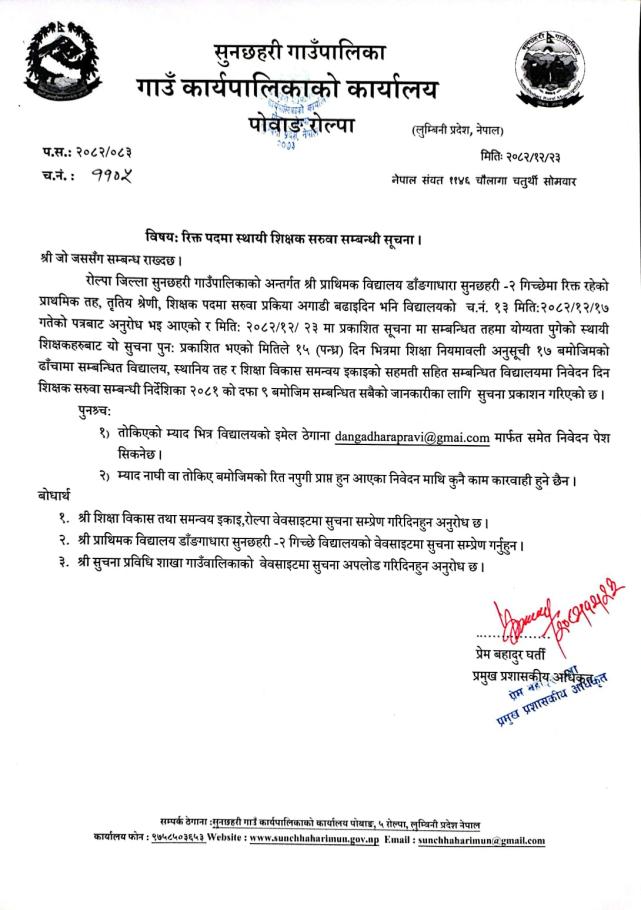 रिक्त पदमा स्थायी शिक्षकसरुवा सम्बन्धी सूचना l