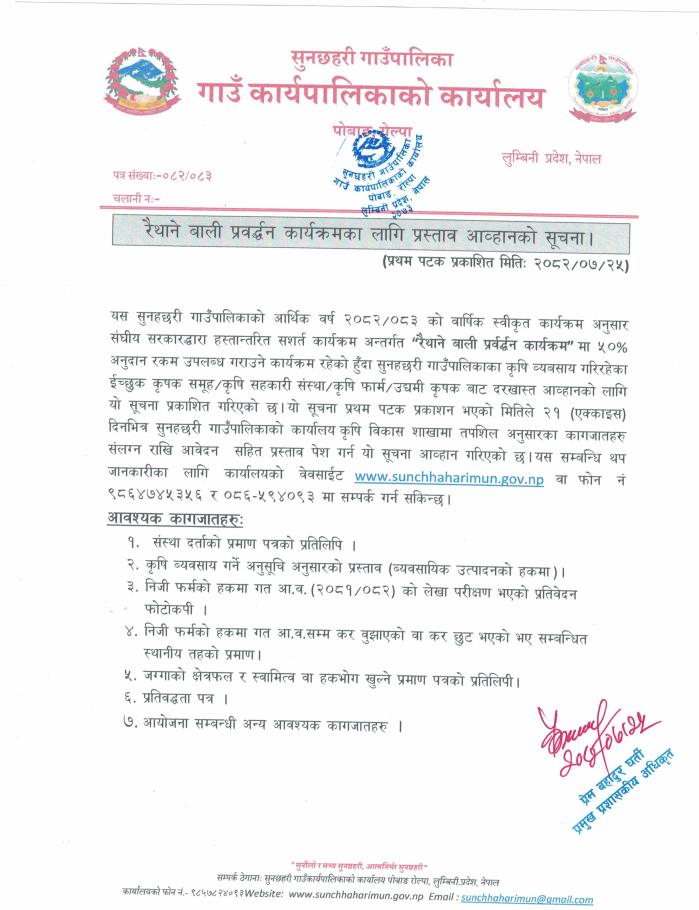 » रैथाने बाली प्रवर्द्धन कार्यक्रमका लागि प्रस्ताव आव्ह्वानको सूचना l