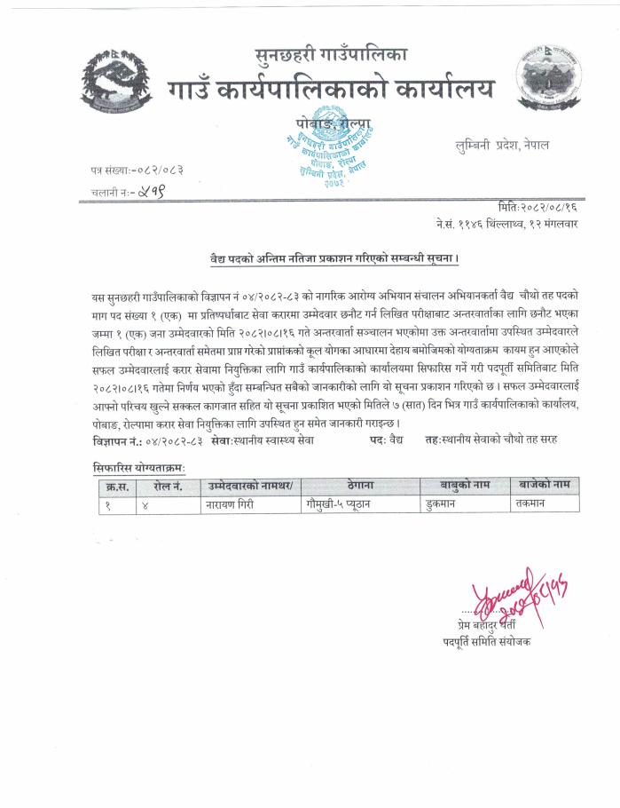 वैद्य पदको अन्तिम नतिजा प्रकाशन गरिएको सम्बन्धी सूचना l