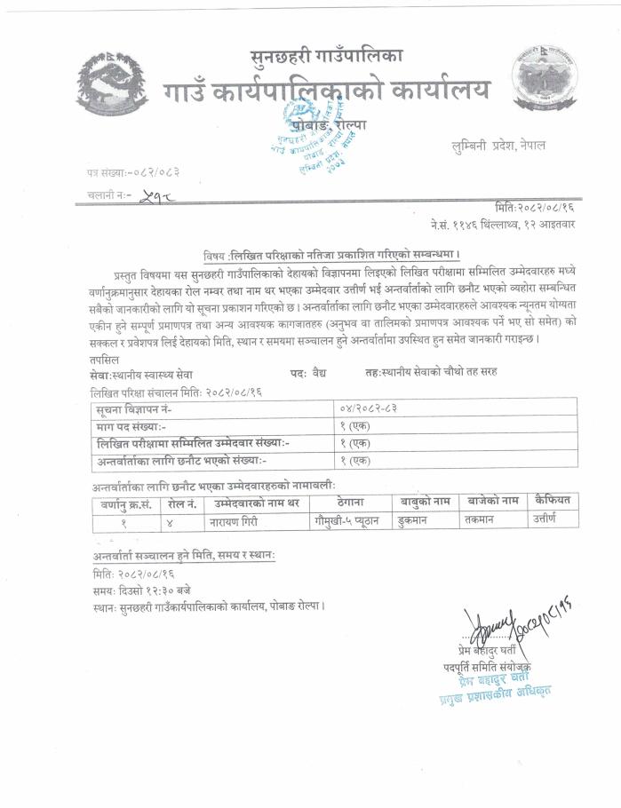 विज्ञापन नं. ०४/२०८२-८३ वैद्य पद र विज्ञापन नं. ०५/२०८२-८३ हेभी सवारी चालक ब्याकहो लोडर अपरेटर पदको प्रारम्भिक संक्षिप्त सूची प्रकाशन तथा परिक्षा मिति कायम गरिएको सम्बन्धी सूचना l