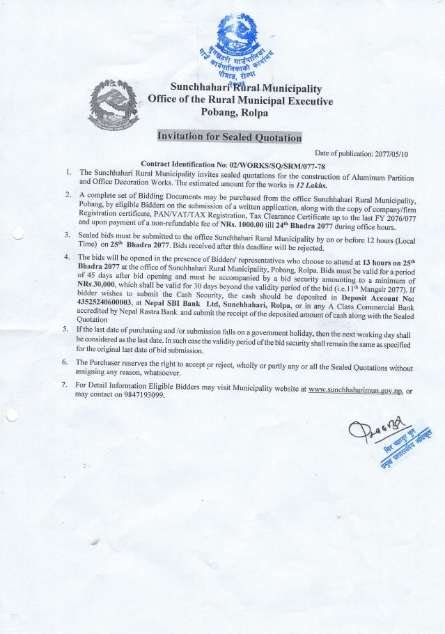» सुनछहरी गाउँपालिकाको अफिस पार्टीसन तथा डेकोरेसन कामको लागि सिलबन्दी दरभाउपत्र आह्वानको सूचना