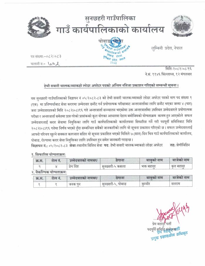 हेभी सवारी चालक/ब्याकहो लोडर अपरेटर पदको अन्तिम नतिजा प्रकाशन गरिएको सम्बन्धी सूचना ।