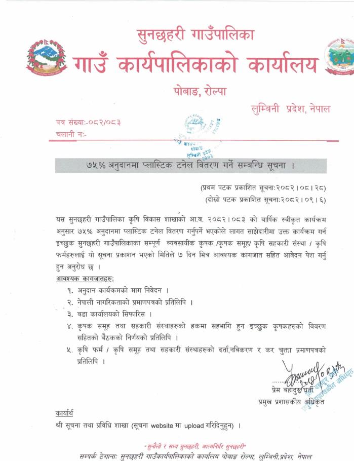 ७५% अनुदानमा प्लास्टिक टनेल वितरण गर्ने सम्बन्धि पुन: सूचना l