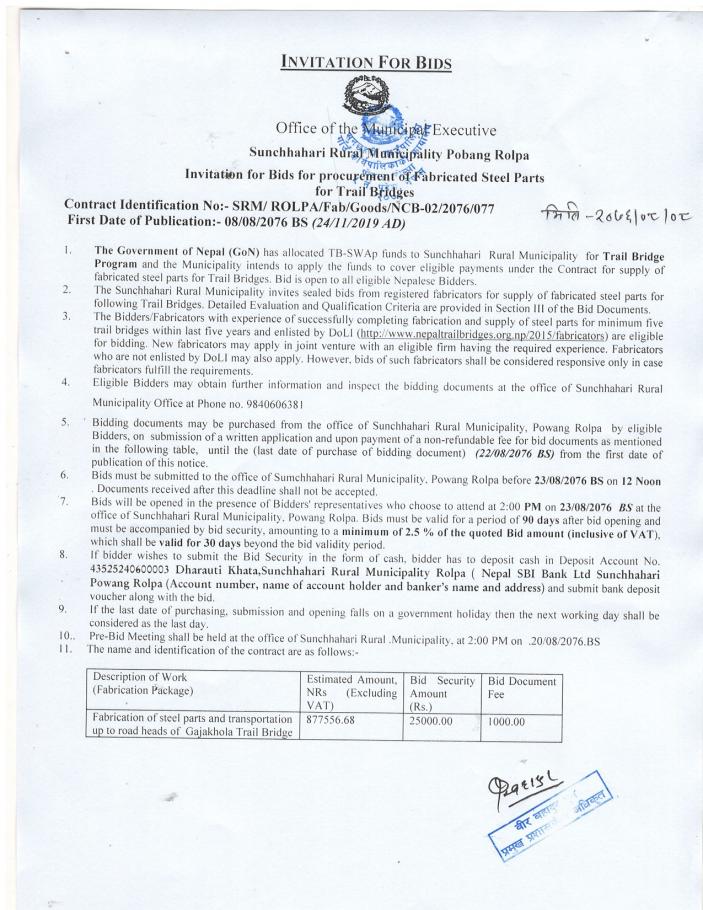 झोलुंगे पुलको सामान Fabrication तथा ढुवानी सम्बन्धि बोलपत्र आवह्वानको सूचना