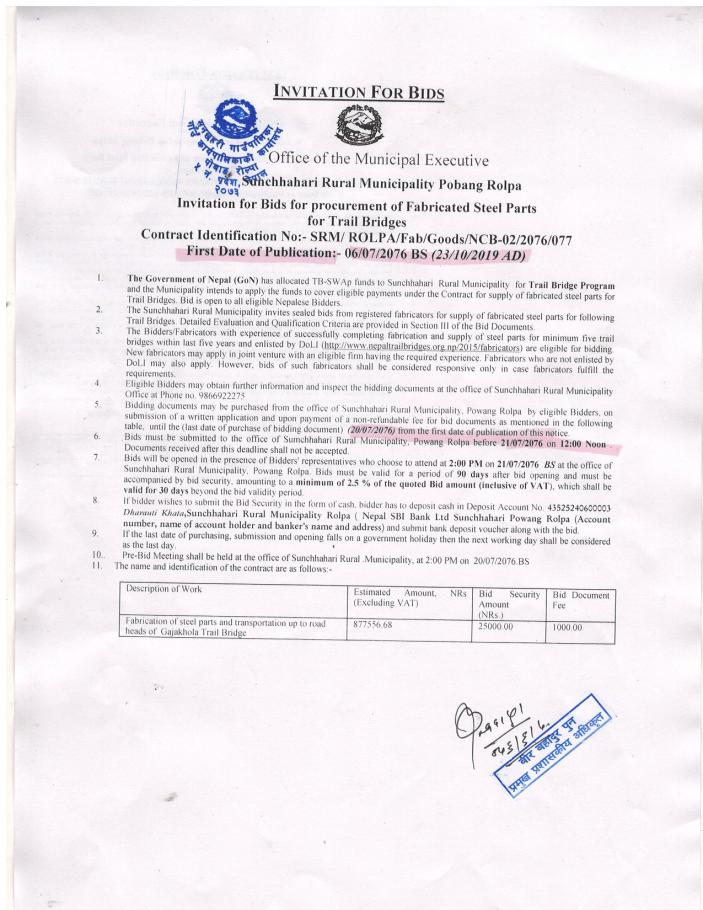 झोलुंगे पुलको सामान Fabrication तथा ढुवानी सम्बन्धि बोलपत्र आवह्वानको सूचना