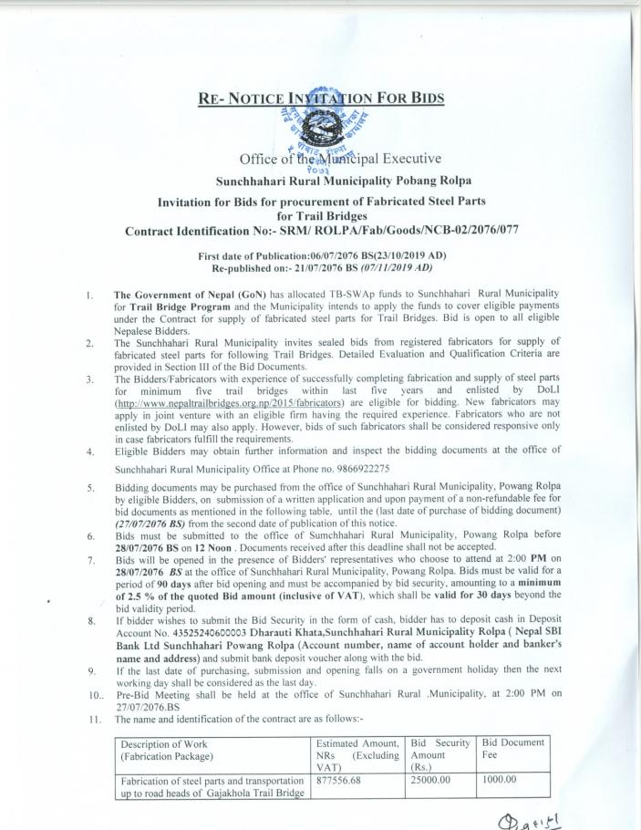 पुन: दोस्रो पटक झोलुंगे पुलको सामान Fabrication तथा ढुवानी सम्बन्धि बोलपत्र आवह्वानको सूचना