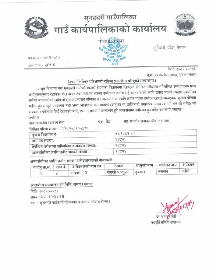 विज्ञापन नं. ०४/२०८२-८३ वैद्य पद र विज्ञापन नं. ०५/२०८२-८३ हेभी सवारी चालक ब्याकहो लोडर अपरेटर पदको प्रारम्भिक संक्षिप्त सूची प्रकाशन तथा परिक्षा मिति कायम गरिएको सम्बन्धी सूचना l